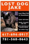 A dog named Jake is missing from the Cedar and Main Street area in Stoneham, and could have traveled as far as Wilmington.
