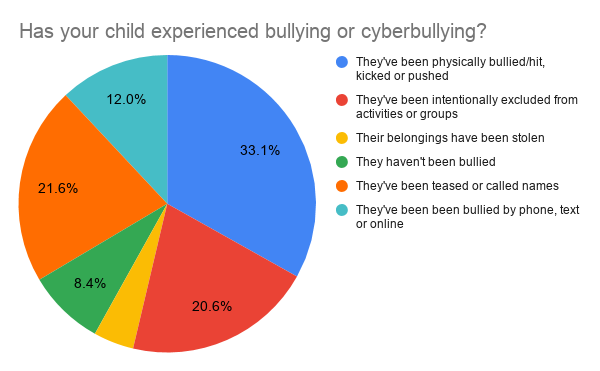 - Bullying took many forms, from teasing and name-calling to exclusion from groups to physical harm such as punching or kicking. Nearly a third of respondents said their children had experienced some sort of physical harm.
