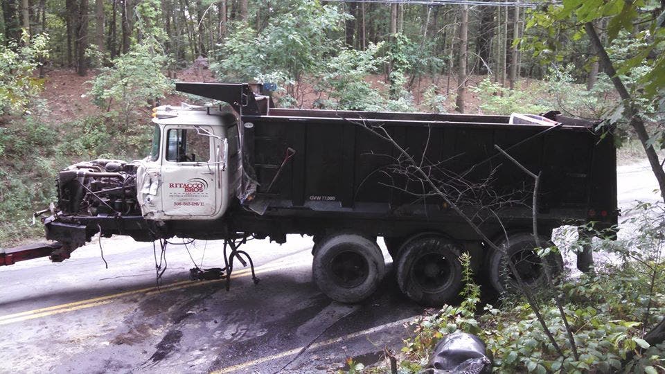 (Photo: One of the two trucks involved in a motor vehicle accident Thursday morning along Rte. 62. Credit: North Reading Police Department.)