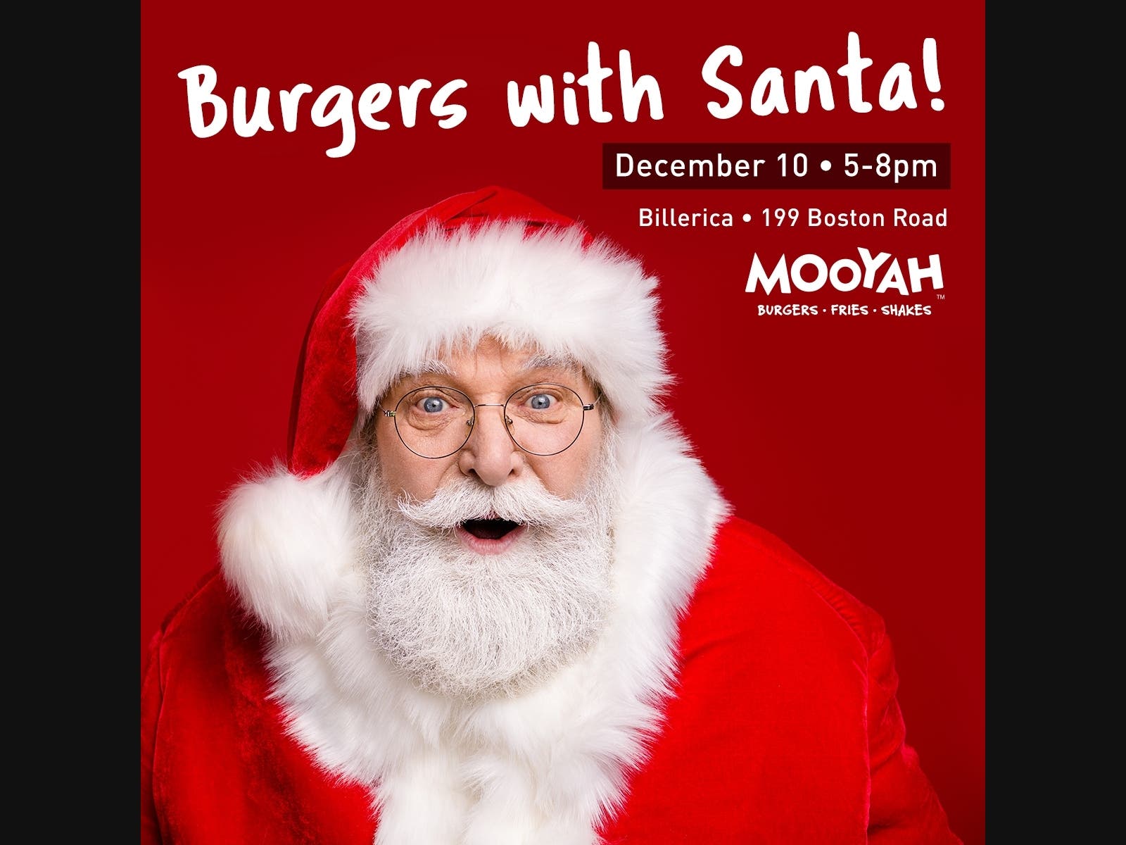 Santa will be making an appearance at MOOYAH Burgers, Fries & Shakes in North Billerica on Fri., Dec. 10, 5-8 pm.