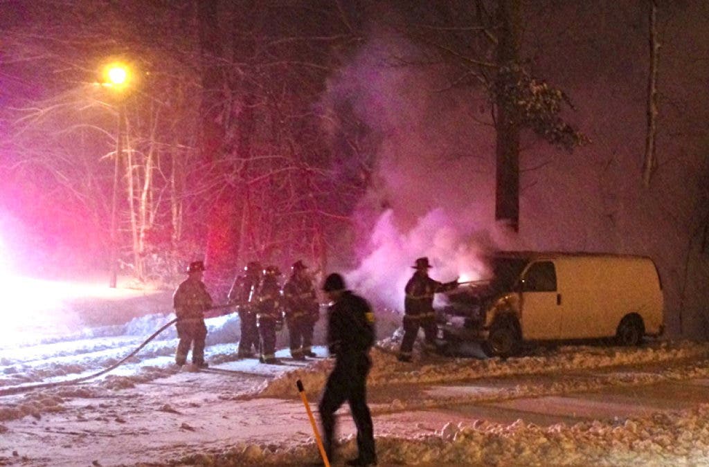 At the same time that flames were shooting through the roof of an Avalon Oaks apartment building, firefighters received a call for a van on fire in the Knights of Columbus parking lot - and all in the middle of a blizzard.