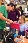 Tuesday night at Acera, the Massachusetts School for Science, Creativity and Leadership in Lowell Ave, that’s exactly what happened: kids were engaging with, say, a talk on immuno-oncology while adults tried to solve a “Marshmallow Challenge” or get their hands on a defense robot. Together, children and their parents (or somebody else’s parents!) worked on math and logic puzzles, remotely steered iRobot’s telepresence robot through a museum miles away, designed printable objects, or watched a drone blow some leaves while flying around in the school’s playground.