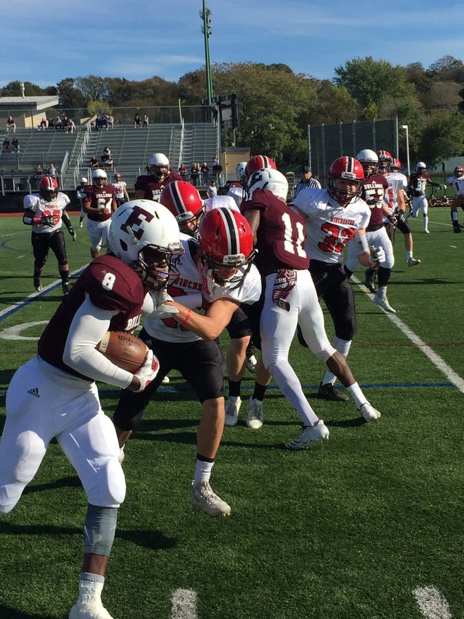 It didn't help that as the anthem played, there just 31 fans in the Winchester stands, meaning there was almost a Sachem cheerleader for each fan in attendance. Lynn English (8-0) took the opening kickoff and in their longest drive of the day went 50 yards in seven plays, with Ski Gaston running it in on fourth-and-goal from the 5-yard line. They wouldn't need seven plays to score the rest of the day.