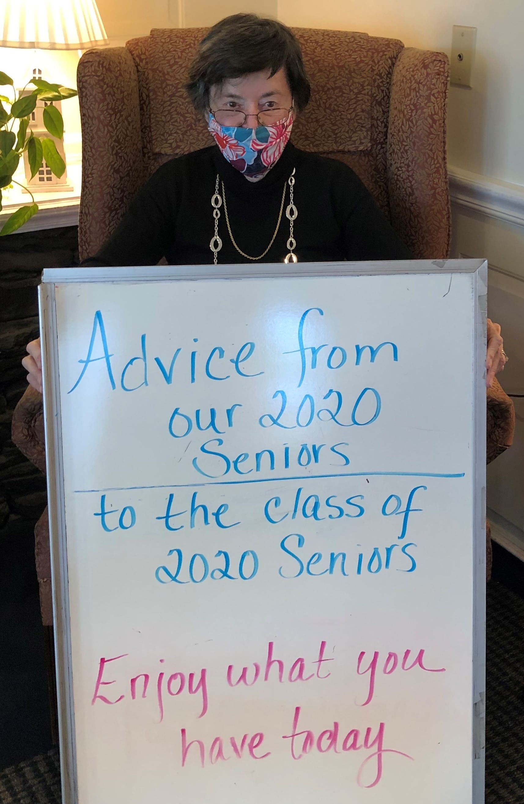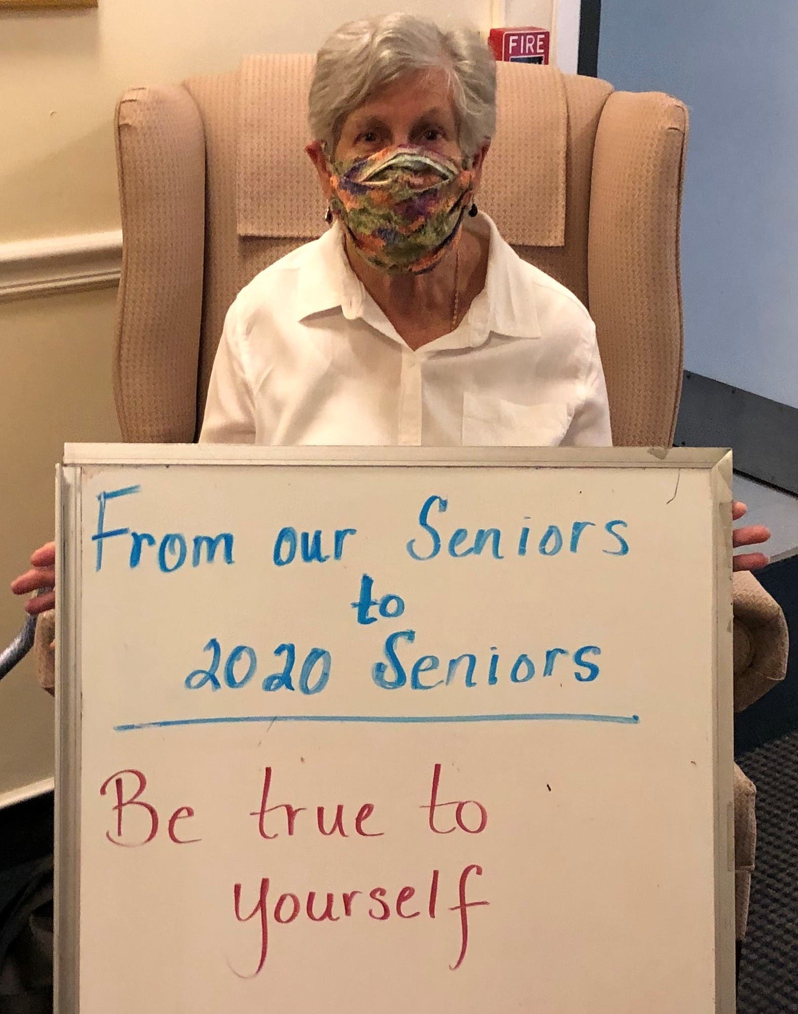 WOBURN, MA — Unable to join family for graduation ceremonies as usual, residents of Woburn's New Horizons at Choate assisted-living facility shared messages with the class of 2020 for a "seniors to seniors" Facebook post.