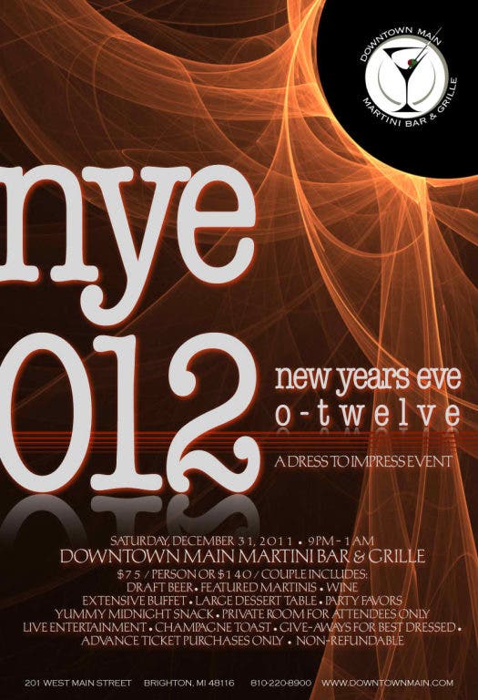1. , 201 W. Main St. in Brighton, hosts a , your choice of draft beer, selected martinis or wine, a large dessert table, party favors, a yummy midnight snack, live entertainment, giveaways for best-dressed party-goers in a room only open to those who've paid the $75 per person/$140 per couple price in advance; call 810-220-8900.