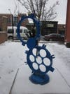 Cannaert also sculpted Sancho Panza, who is Don Quixote’s neighbor-turned-squire in the novel, using repurposed carbon steel castings. The connection is less direct, but Sancho Panza’s bright blue coat of paint gives it a sense of whimsy that echoes that of the novel.