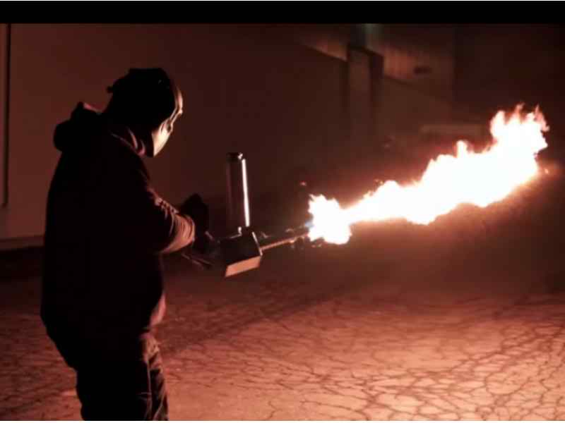 A Metro Detroit company, Ion Productions Team, manufactures personal flamethrowers. (Screenshot via YouTube)