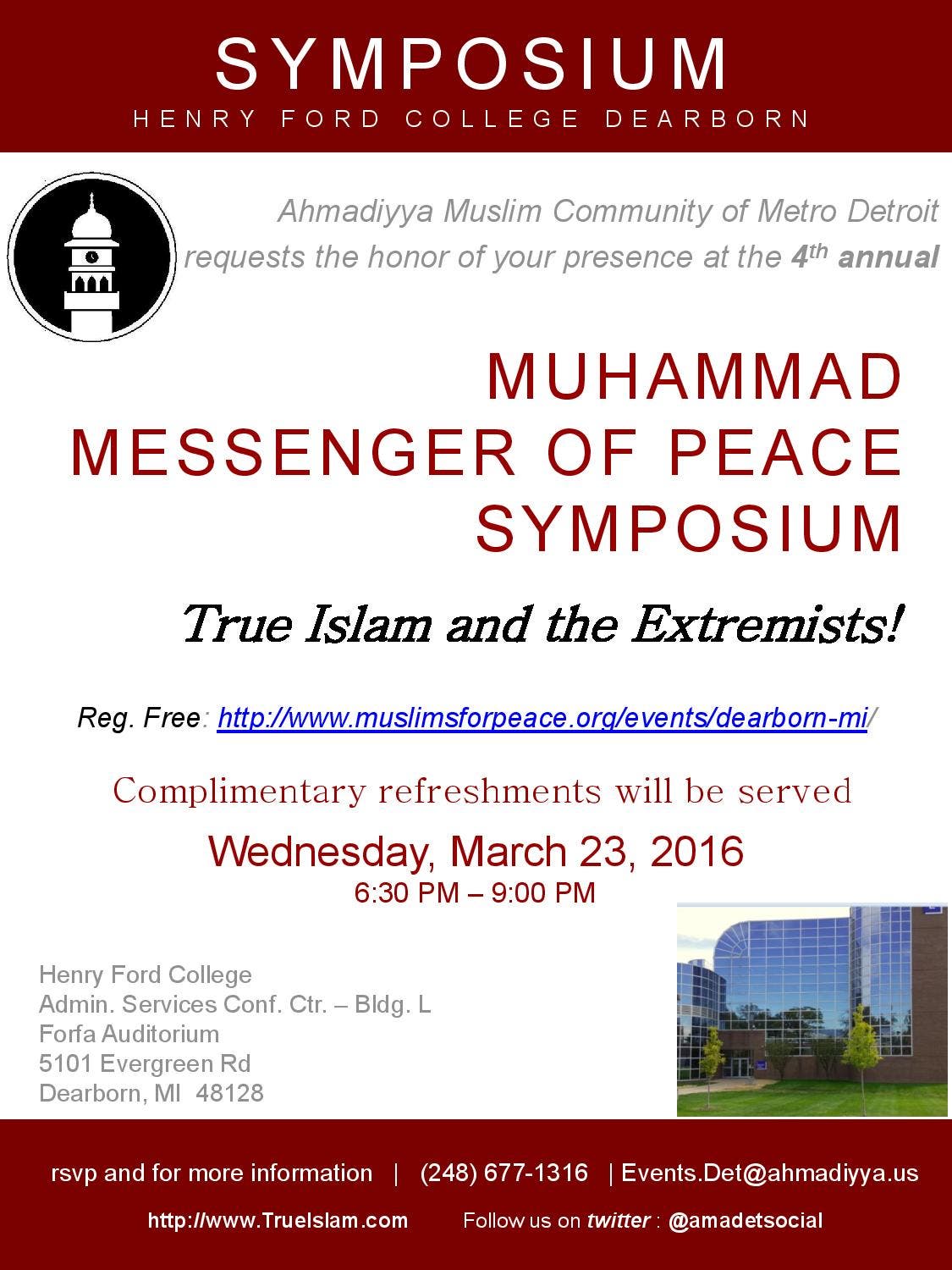 The program will be held on Wednesday March 23rd at 6:30 PM at Henry Ford College. Community leaders and interfaith representatives from all over Metro Detroit will come together to share in the life and history of the founder of Islam - Prophet Muhammad (peace be unto him) and dispel any myths associated with his life.