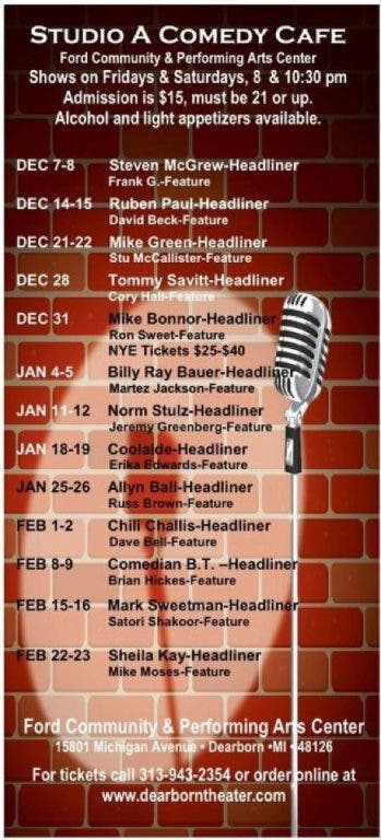 The Comedy Cafe offers national and international performers weekely at the Studio A Comedy Cafe in the beautiful Ford Community and Performing Arts Center every Friday and Saturday 2 shows one at 8 pm and one at 10:30 pm we also have shows on New Years Eve one at 7:30 pm for $25.00 and a 10:15 Show with champagene toast and party favors for $40.00 the box office can be reached at 313-943-2354 or tickets can be purchased online at www.dearborntheater.com
