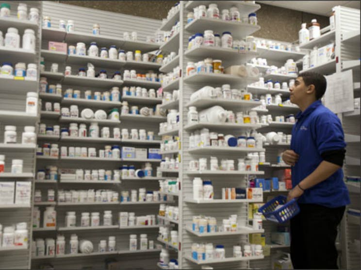 A student at Henry Ford Early College works at the pharmacy of Henry Ford Health System in Dearborn as part of the pharmacy assistant program. (Photo via Henry Ford Early College)