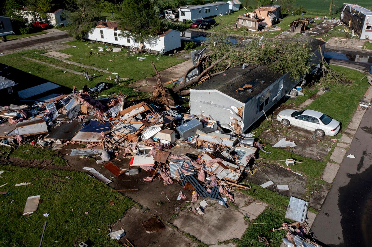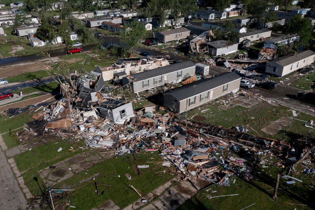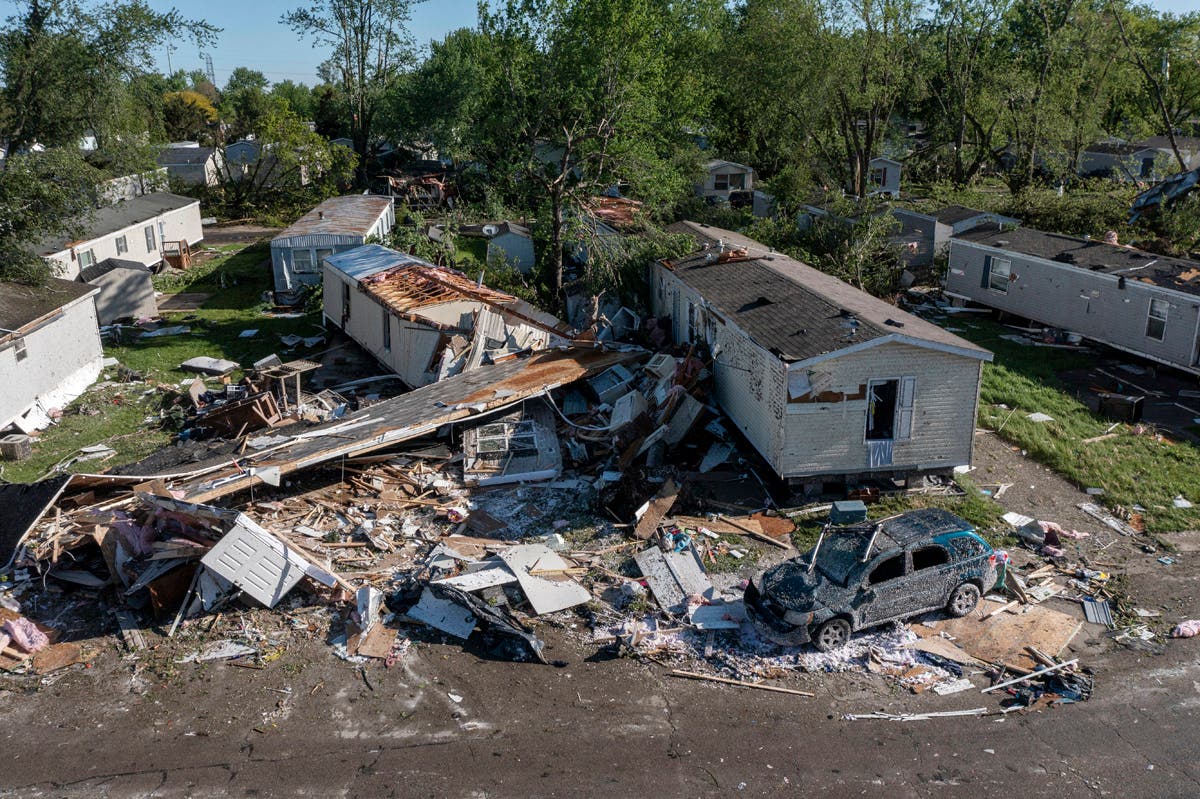 Storm damaged mobile homes are surrounded by debris at Pavilion Estates mobile home park just east of Kalamazoo, Michigan, Wednesday, May 8, 2024. A tornado ripped through the area the evening of May 7. (Neil Blake/The Grand Rapids Press via AP)Storm damaged mobile homes are surrounded by debris at Pavilion Estates mobile home park just east of Kalamazoo, Michigan, Wednesday, May 8, 2024. A tornado ripped through the area the evening of May 7. (Neil Blake/The Grand Rapids Press via AP)Storm damaged mobile homes are surrounded by debris at Pavilion Estates mobile home park just east of Kalamazoo, Michigan, Wednesday, May 8, 2024. A tornado ripped through the area the evening of May 7. (Neil Blake/The Grand Rapids Press via AP)Storm damaged mobile homes are surrounded by debris at Pavilion Estates mobile home park just east of Kalamazoo, Michigan, Wednesday, May 8, 2024. A tornado ripped through the area the evening of May 7. (Neil Blake/The Grand Rapids Press via AP)Debris is seen from a damaged FedEx facility, where 50 people were trapped but later evacuated after a tornado in Portage, Michigan, Tuesday, May 7, 2024. (Brad Devereaux/Kalamazoo Gazette via AP)Debris is seen from a damaged FedEx facility, where 50 people were trapped but later evacuated after a tornado in Portage, Michigan, Tuesday, May 7, 2024. (Brad Devereaux/Kalamazoo Gazette via AP)FedEx trucks sit outside a damaged FedEx facility where 50 people were trapped but later evacuated after a tornado in Portage, Michigan, Tuesday, May 7, 2024. (Brad Devereaux/Kalamazoo Gazette via AP)Debris litters the ground near a damaged building after a tornado swept through the area of the Pavilion Estates mobile home park, in Kalamazoo, Michigan, Tuesday, May 7, 2024. ( J. Scott Park/Jackson Citizen Patriot via AP)Buildings appear damaged after a tornado swept through the area of the Pavilion Estates mobile home park, in Kalamazoo, Michigan, Tuesday, May 7, 2024. ( J. Scott Park/Jackson Citizen Patriot via AP)People leave after a tornado swept through the area of the Pavilion Estates mobile home park, in Kalamazoo, Michigan, Tuesday, May 7, 2024. Multiple injuries were reported at the park. (J. Scott Park/Jackson Citizen Patriot via AP)
