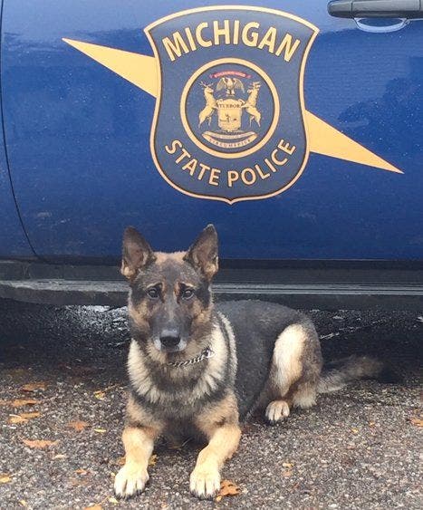 DETROIT, MI — Otto, a German shepherd police dog, is on his way to earning his place among some of the most storied canine officers in the history of the Michigan State Police. He sniffed out more than 1,000 opioid pills in December, found $13,000 in cash in an accused drug dealer’s car a month later and this week, he sent a warning to criminals that if they plan on running from troopers, they’d better wear shin guards.