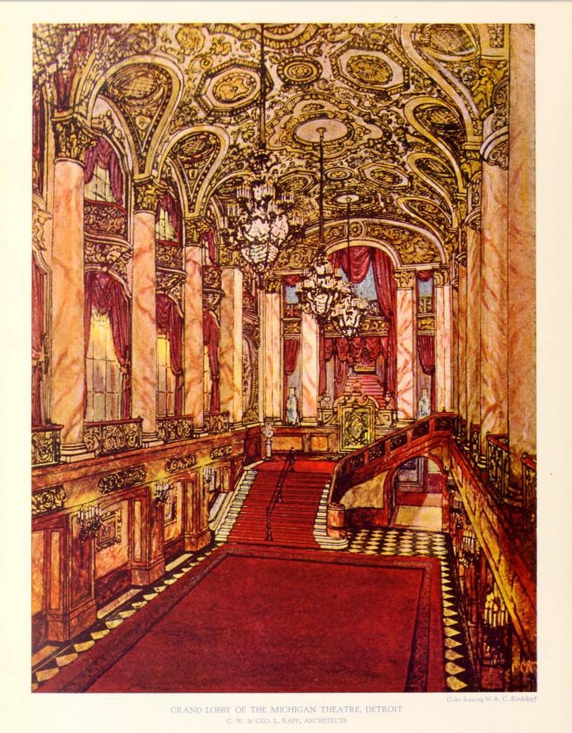 “For the first time I saw the Michigan Theatre as a dowdy old lady; some of the red velvet railings had been ripped out, and the floor was littered with much debris. … We mounted the grand stairway with its red carpet littered with mashed paper cups and some of their contents, to the once elegant mezzanine, where we found vodka bottles and beer cans piled in corners. … My mind, rebelling at the sordid scenes we had witnessed, thought of ancient Rome having reached new heights of architectural beauty, only to be invaded and ravaged by barbarian tribes.”