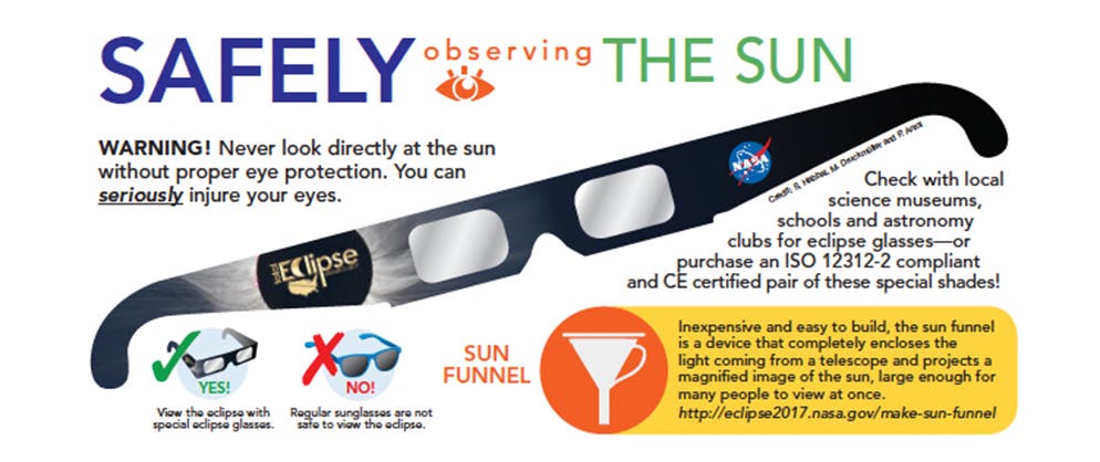 Your sunglasses won’t protect you. You can buy special glasses commercially — we found these eclipse glasses on amazon.com for $12.69 — but you may want to check with local science museums, schools and astronomy clubs for certified glasses. Or, you can make your own sun funnel or make a pinhole camera.
