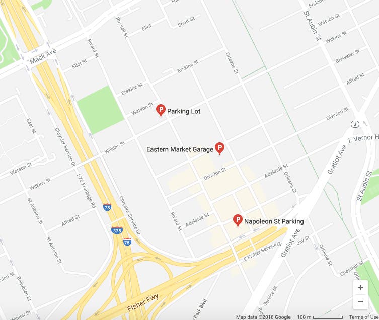 Eastern Market is located at 2934 Russell Street. There’s three parking lots and structures in the area and plenty of street parking. Parking is free on Sundays, including the Eastern Market Parking Garage on Riopelle Street and the large lots at the north corners of the market on Wilkins Street. At peak times you may have to hunt a little, but people frequently come and go, opening up spaces.