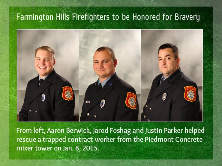 Three Farmington Hills firefighters will be honored with medals for bravery for their heroism in the rescue of a victim trapped in the Piedmont Concrete inferno in January.