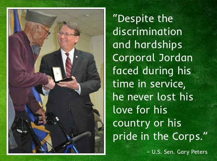 “Despite the discrimination and hardships Corporal Jordan faced during his time in service, he never lost his love for his country or his pride in the Corps,” Peters said. “Our nation owes the Montford Point Marines a debt of gratitude than can never be fully repaid, and it was my great honor to present the Montford Point Congressional Gold Medal to Mr. Jordan.”
