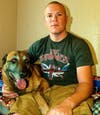 Cpl. Bret Reynolds and Bernie, a retired military working dog, sit on their bed. Once her handler, now her proud owner, Reynolds is excited to be able to bring her home. Unlike many law enforcement working dogs, military working dogs live in kennels aboard the air station. Bernie’s friendly nature makes getting along with Reynolds’ other dogs a breeze, and Bernie enjoys playing with them, even at 11 years old.