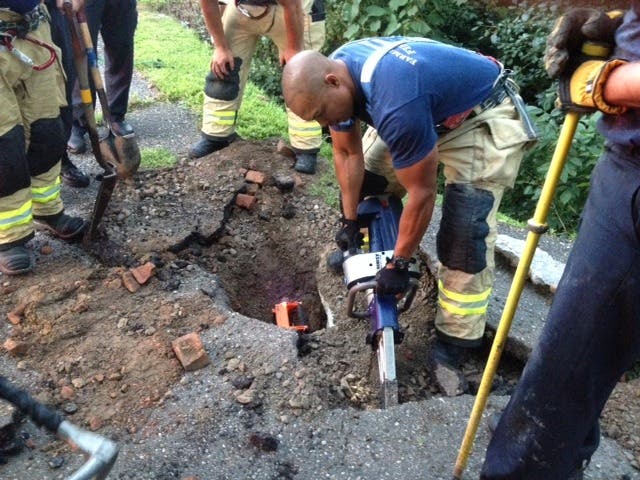 Nine irefighters from two units had to use equipment normally reserved for human rescues, including the Jaws of Life and hand tools to dig through the asphalt and dirt. Once the rescue team made a large enough hole, Lieutenant/Paramedic Donald Schinske reached in and pulled the scared but uninjured dog out.
