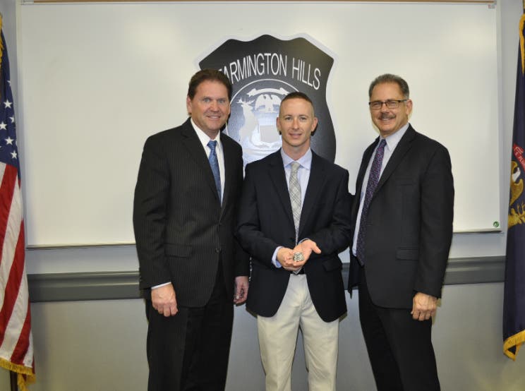From left, City Manager Dave Boyer, Officer Nicholas Stirrett and Police Chief Chuck Nebus at Stirrett’s swearing-in ceremony. (Photo submitted by the city of Farmington Hills)