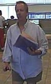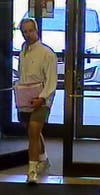 The suspect is described as a white male in his 50s, standing between 5 feet, 8 inches and 5 feet, 10 inches and weighting around 180 pounds. He has short blond hair and a blond mustache, and was last seen wearing a light-colored front-button dress shirt with rolled-up sleeves, khaki shorts, white socks reaching mid-calf and white tennis shoes.
