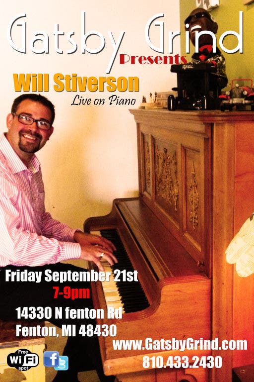Join us at Gatsby Grind for a great Piano evening with Will Stiverson live, come hungry humus and salads dips and wraps, great coffee and desserts!