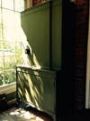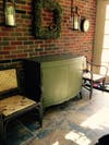 Lovely custom painted set includes Sheraton style server, china cabinet and oval Baker dining table with one leaf (shown). All 3 pieces are done in a beautiful distressed olive! Pick-up only. Don't hesitate or it will be gone!