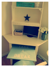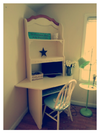 This desk was salvaged and restored from an estate sale on the East Side. It was featured on Happy Now Blogspot and Boutique. It features a detachable hutch as well as a sliding desk addition. It has been repainted to it's original color with exposed wood trim at the top. Custom-stenciled chair included. This piece would be perfect for a cheery study or home office. Please call 586.612.3381 for details. $150 OBO We are happy to discuss all offers.