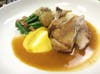 McKenzie presented a trio of chicken: a breast of chicken arrosé, braised chicken, and rustic country farce with prosciutto and parmesan crunch. It was accompanied by sweet corn purée, mashed potatoes, green beans and natural jus lié.
