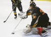 The visiting Eagles took to the ice and the words to heart. They ripped off five shots in the first 30 seconds before Blazny walked the talk and put the puck behind Zeddell in the midst of a pile-up in front of the net.