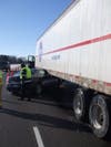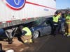 Thompson said diesel fuel was leaking from the semi, and the right lane of the highway was closed. The car slid under the truck, Thompson said, but no injuries have been reported at this time.