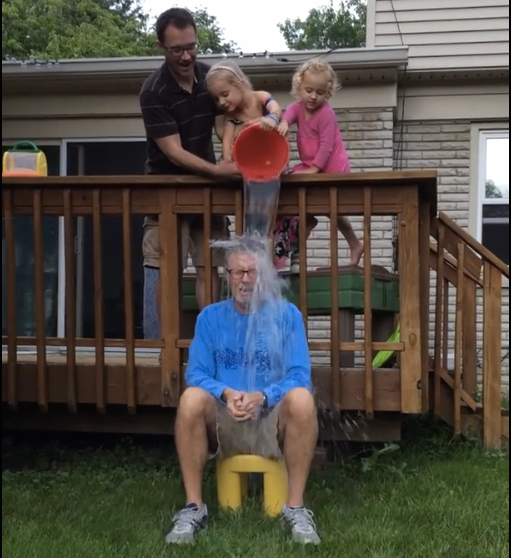Mike Flanagan’s granddaughter, Ellen Avery, poured ice water over her grandfather’s head as part of the ALS Ice Bucket Challenge. Flanagan used the occasion to make back-to-school remarks. (Screenshot: YouTube video)