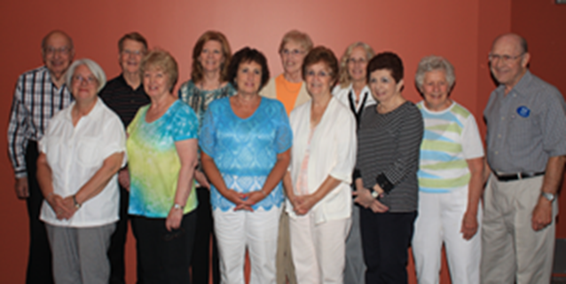 Photo of Friends Library Board: (Pictured left to right in back row: Bob Cutler , Pat Brunett, Carol Hoffman, Evelyn Cadicamo, Sue Johnson, front row: Gale Ford, Marilyn Amberger, Julie Abrams, Barb Brunett, Carol Bauer, Evelyn Young and Jim McLean)