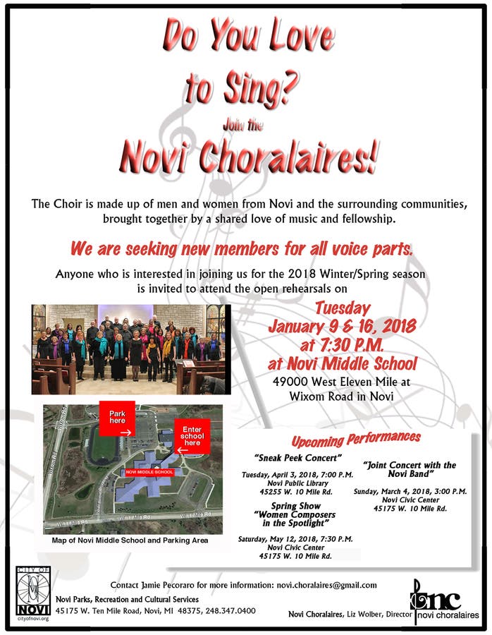 Do you love to sing? Would you like to meet new people and take part in sharing the joy of music within our community? Join the Novi Choralaires! This is a community chorus of men and women from Novi and the surrounding area, who perform concerts for the public and at many community events. The current up-coming season is January through May, with rehearsals on Tuesday evenings from 7:30 – 9:30 P.M.