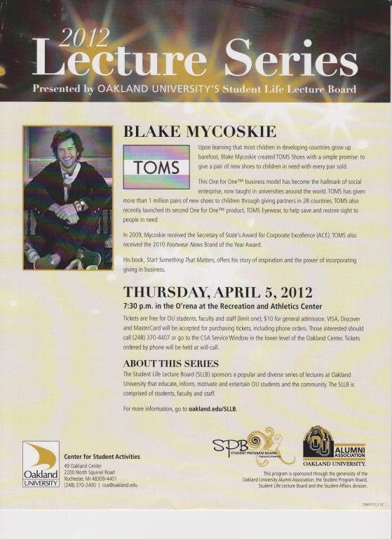 Blake Mycoskie, founder of TOMS shoes and eyewear and the man behind the One for One movement, will be at Oakland University for a speaking engagement on April 5th. It will be held in the Campus Recreation Center of Oakland University. The event starts at 7:30 p.m. with a VIP reception following immediately after. Doors open at 6:00 p.m. This event is free to all Oakland University students, staff, and faculty members and $10 for general admission (tickets are available at the Center for Student Activities service window in the lower level of the Oakland Center at Oakland University.) The event is appropriate for all ages and will be an evening to remember providing the audience with the desire to Start Something That Matters.