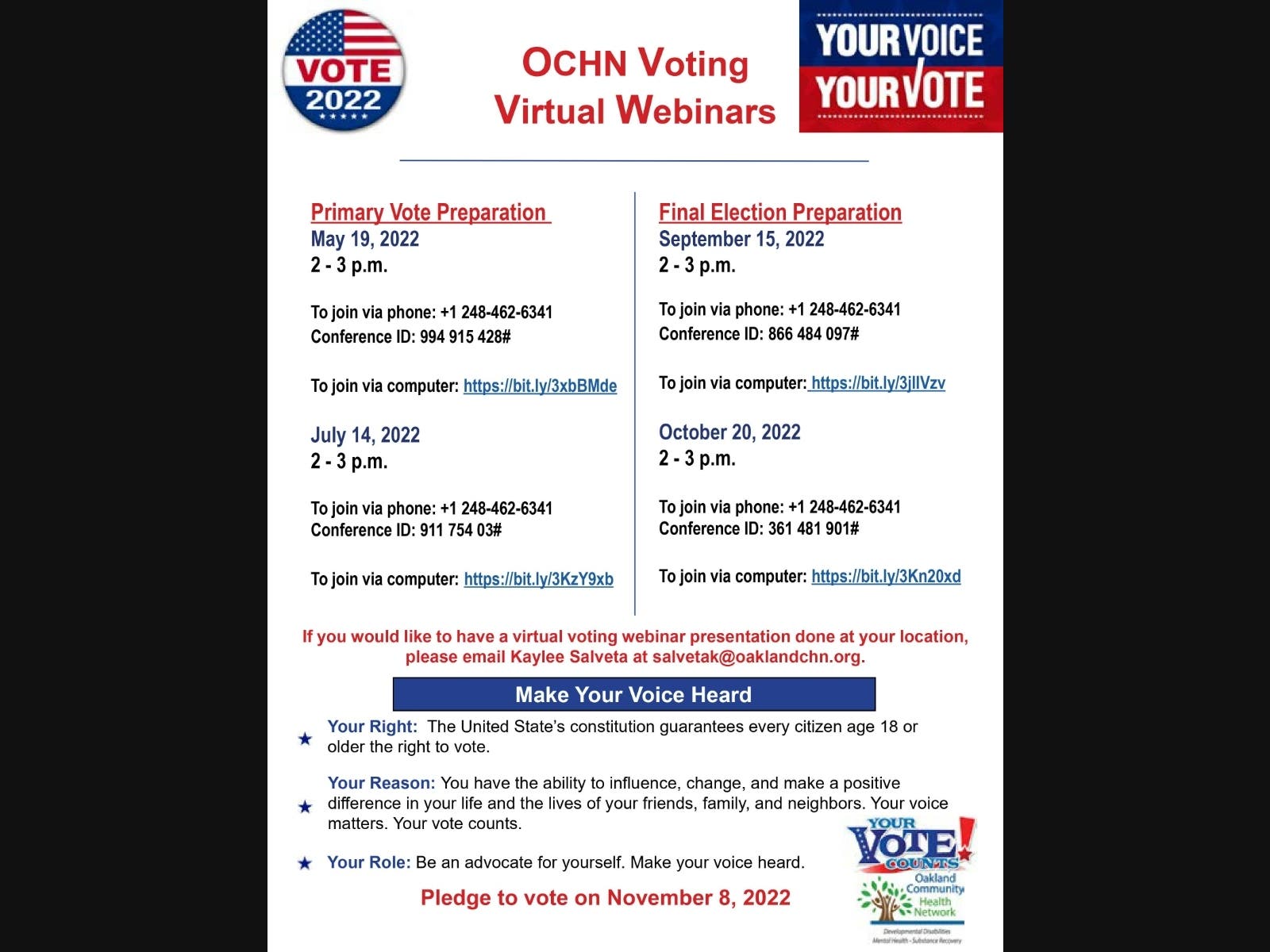 Oakland Community Health Network (OCHN) is hosting the following voting virtual webinars. Please exercise your right to vote and participate. For further details, please see attached flyer.