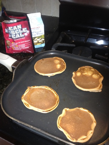 I'm not a huge fan of measuring things, so I just toss in about 1/2 cup protein powder (any flavor will work), then add some egg whites. Mix it all together until it resembles pancake batter, toss on the griddle and flip! Add some spray butter and you're all set! If you're feeling extra sassy, cinnamon and stevia on the top is scrumptious.