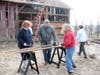 During the next several months, while money was raised and the foundation was poured, volunteers worked on various pieces of the Flumerfelt barn. They made wooden pegs, organized the boards (which had been marked when taken down so that they could be put back in the correct order), and fixing bents (an assembly of posts, beams and bracing that make up the barn frame).
