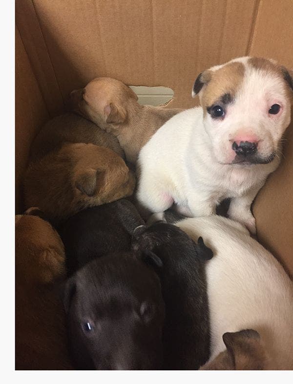 The top of the urine soaked cardboard box was open. Inside, the nine male and 10 female puppies were climbing over each other, trying to get out.