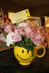 Teleflora donates the Be Happy® Mugs, and florists work with local wholesalers and growers to secure flower donations. With these donations, Teleflora florists create the cheerful Be Happy® Bouquets and delivers them to local hospitals, residents of nursing homes, recipients of Meals on Wheels, and other organizations.