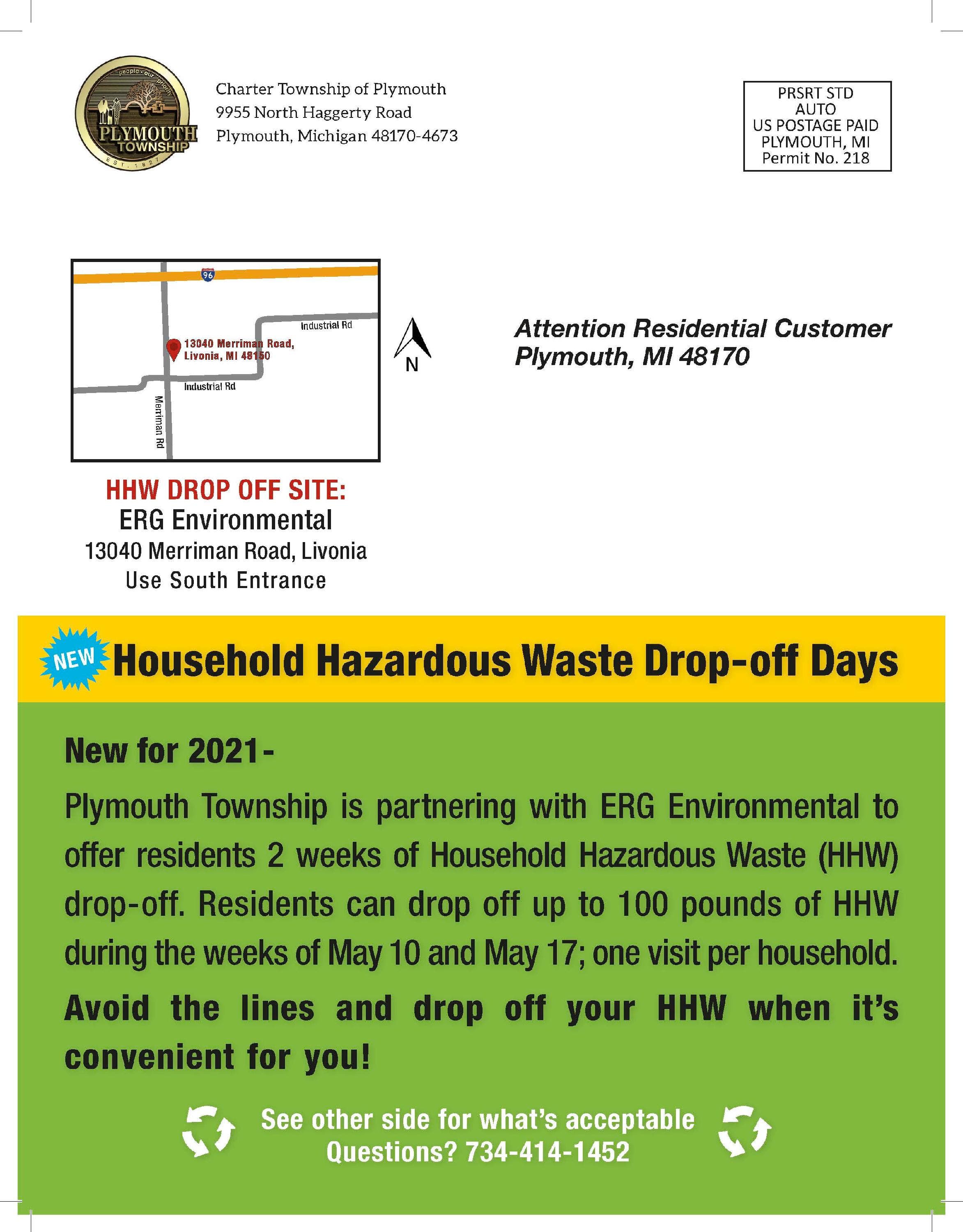 Plymouth Township is partnering with ERG Environmental to offer residents 2 weeks of Household Hazardous Waste (HHW) drop-off.