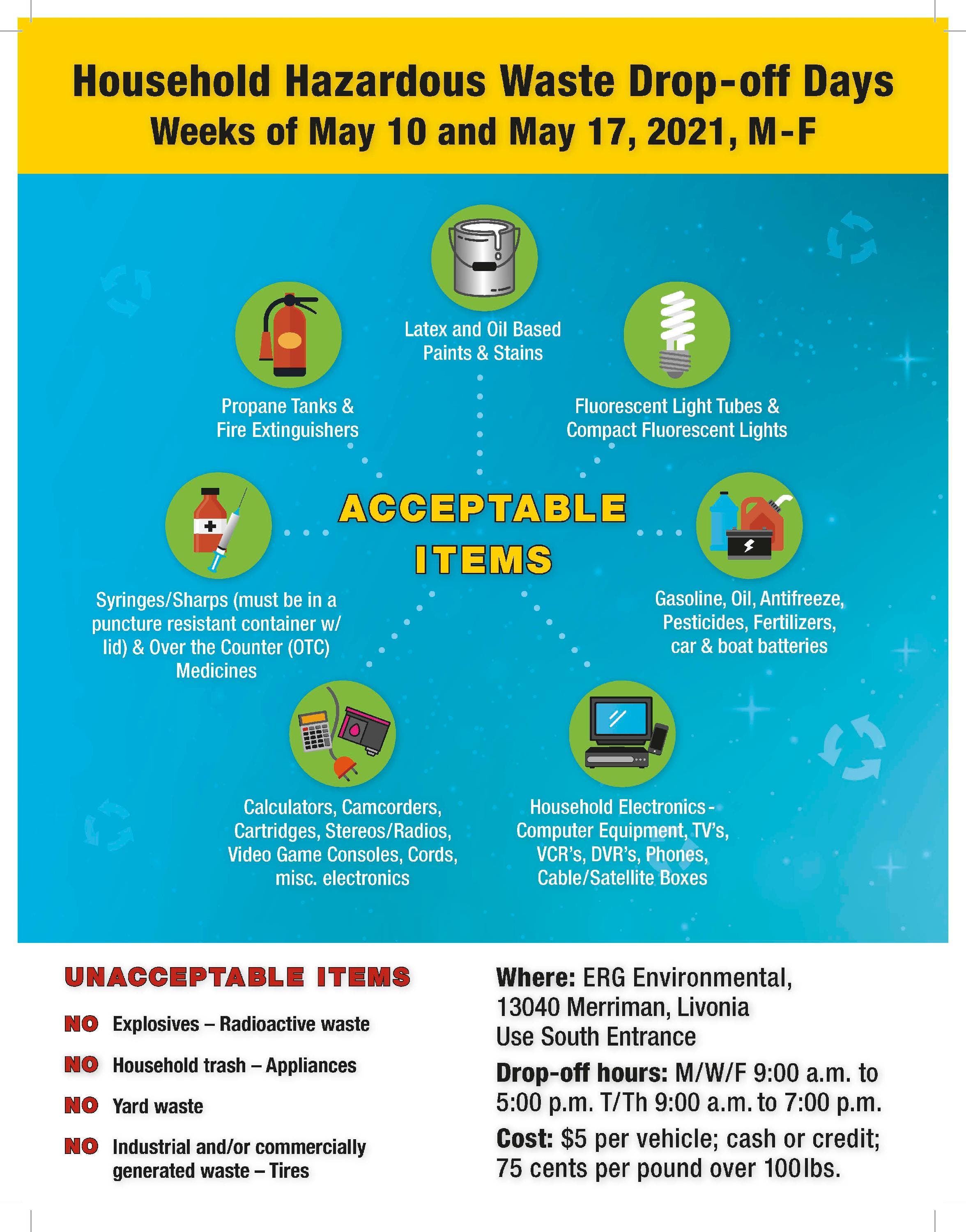 Residents can drop off up to 100 pounds of HHW during the weeks of May 10 and May 17; one visit per household.