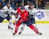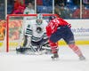 Photos by Rena Laverty - (1) Plymouth defenseman Gianluca Curcuruto checks Oshawa’s Michael Dal Colle, a first round pick of the New York Islanders; (2) Whalers goaltender Alex Nedeljkovic goes one-on-one with Oshawa’s Joe Manchurek.