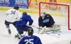 The Blues and White played two five-man shootouts in the afternoon session. They tied, 1-1, in the first session, with Chris Albertini scoring for the Whites and Spencer Lee replying for the Blues. The Blues took the second session, 3-1, with JT Miller, Colin MacDonald and Connor Carrick scoring. Rakell scored for the Whites in the shootout.