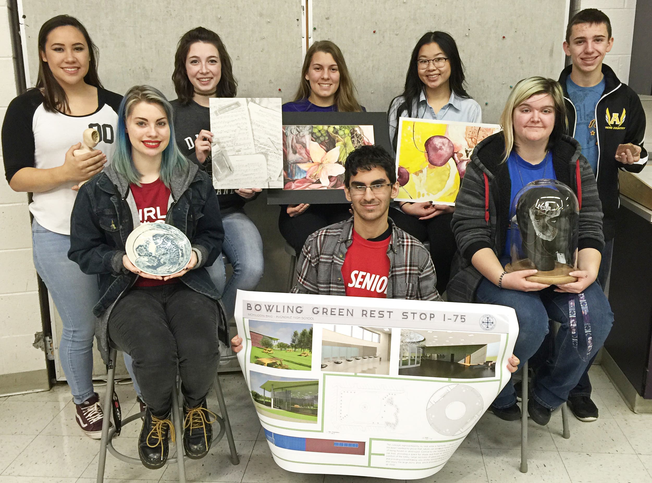 Eight Avondale High School seniors won recognition by the Southeastern Michigan Scholastic Art Awards program for their exceptional artistry and will be honored during a ceremony at the Detroit Film Theater at the Detroit Institute of Arts on February 8th. The students, pictured above, are Gold Key winners, Abigail Tang (for her portfolio) and Selena Nault (for her portfolio); Silver Key winners Mohiuddin Baig (for Architecture), Brooke Blanchette (for painting), Zachary Loyd (for jewelry), Isabella Fucinari (for ceramics and glass) and Hannah Kroesche (for drawing); and Honorable Mention winners Ashley Palyzayia (for painting) and Abigail Tang (for sculpture).