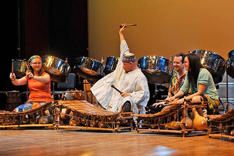 A 40th anniversary should be celebrated with gusto, and the World Music program at Oakland University intends to do just that on Friday, Nov. 6, with two 40th Anniversary Concerts featuring two guests. Both Ghana’s master musician Bernard Woma and Professor Emeritus Marvin (Doc) Holladay, who established OU’s World Music program in 1975, will play with the African Ensemble, the Steel Band and the World Percussion Ensemble.