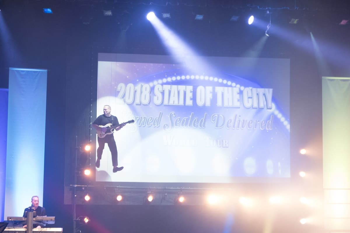 ROCHESTER HILLS, MI — Mayor Bryan K. Barnett delivered his 12th annual State of the City Address at Stoney Creek High School last week, complete with guitar riffs and orchestral strikes. With an electric guitar in hand, Barnett descended onto the stage via a fly system to the sounds of the classic song and theme for the event “Signed, Sealed, Delivered” to spotlight the latest accomplishments in the city.