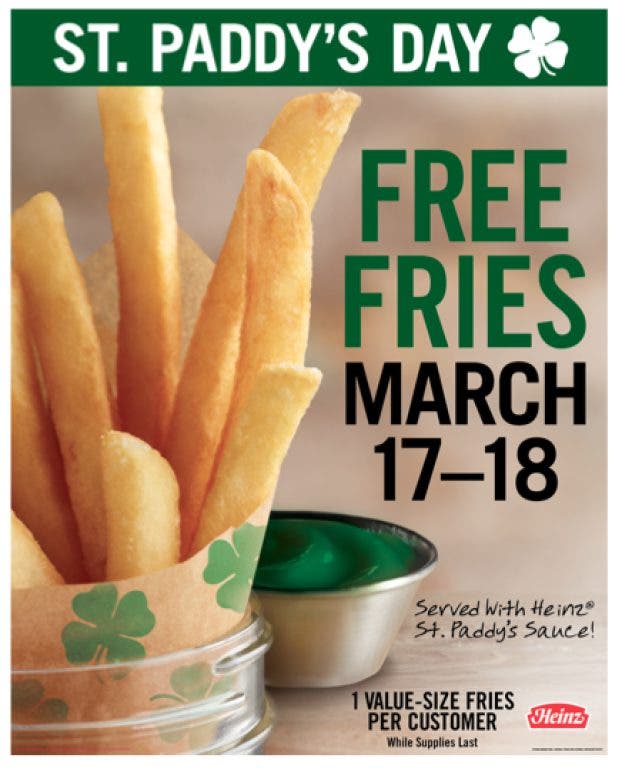 “Free fries for St. Patrick’s Day weekend is the Burger King way of sharing the luck of the Irish with all of our guests,” said Alex Macedo, senior vice president, North America marketing, Burger King Corp. “We’re especially excited to have teamed up with Heinz, makers of America’s Favorite Ketchup, to offer a fun and festive green dipping sauce on the side.”