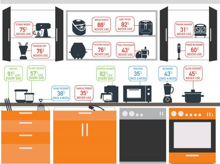 Among the least-used items: bread makers (88 percent never use), hand blenders (60 percent never use), fondue sets (76 percent never use), deep fryers (82 percent never use) and popcorn makers (76 percent never use).