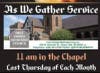 As We Gather: Finally, the church holds special services at 11 a.m. on the last Thursday of each month, called As We Gather. The services are held in the chapel.